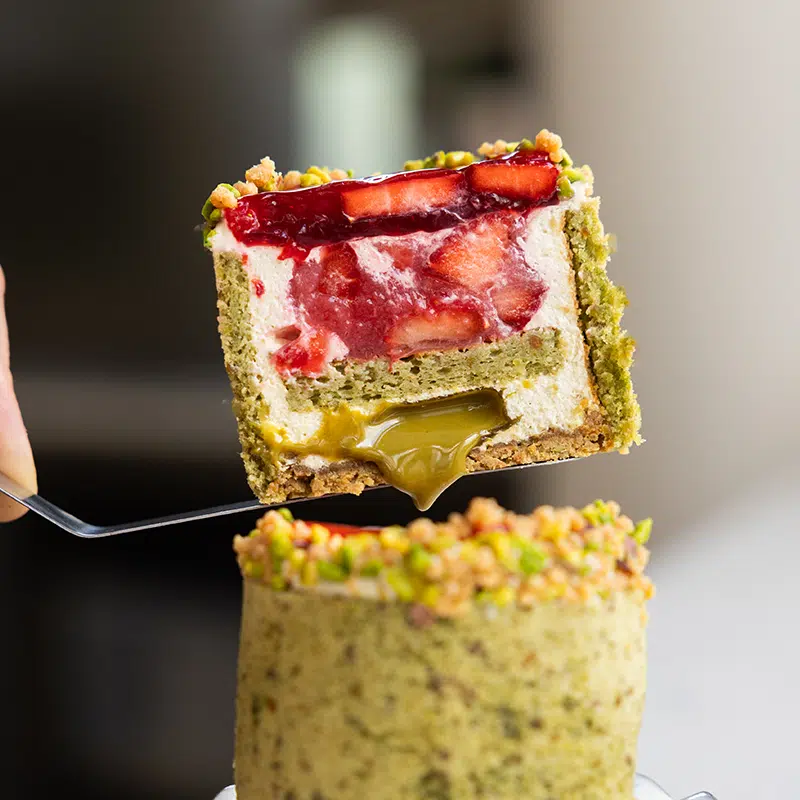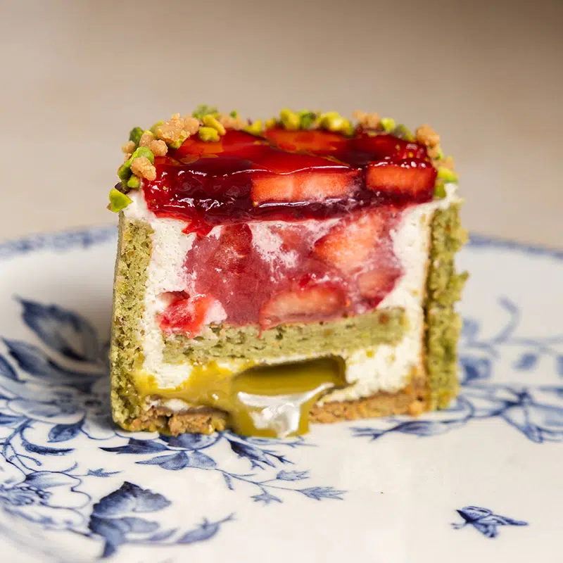Venez découvrir notre nouveauté, la charlotte pistache fraise ! Cette pâtisserie gourmande met à l’honneur la pistache et la fraise, annonçant le changement de saison !